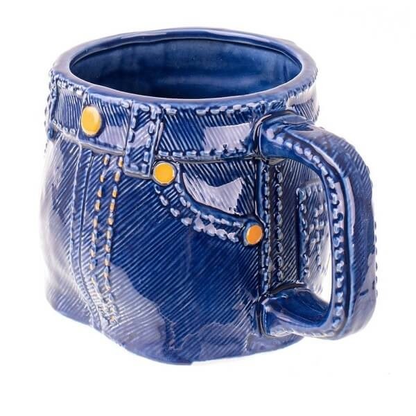 Μια κούπα τζιν φτιαγμένη με προσοχή στη λεπτομέρεια (ραφές, κουμπιά, τσέπες) ζωγραφισμένη στο χέρι.