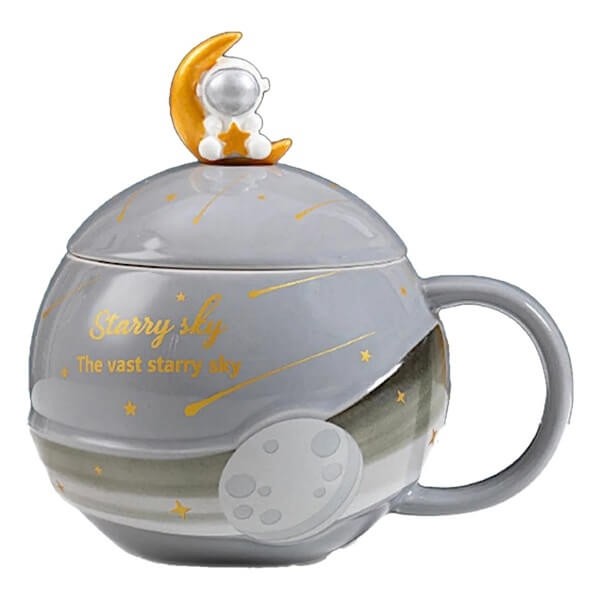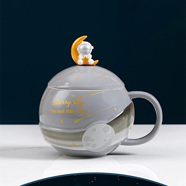 Κεραμική τρισδιάτατη κούπα με καπάκι και κουταλάκι αστροναύτη, για όσους αγαπούν το διάστημα, τα αστέρια και τους πλανήτες!