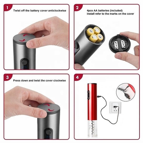 Η χρήση του είναι πολύ εύκολη: αφαιρέστε το κάλυμμα από την βάση του μπουκαλιού, τοποθετήστε το τιρμπουσόν και πατήστε το κουμπί. Σε δευτερόλεπτα μόνο ο φελλός αφαιρείται.
